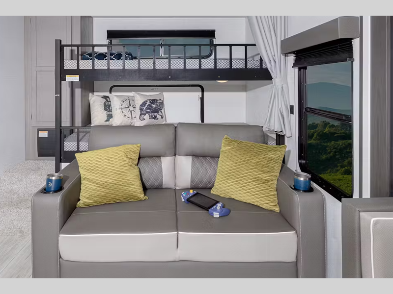 Sleeps 9 Slides 2 Length 35 ft 11 in Ext Height 11 ft 3 in Interior Color Pewter Hitch Weight 1045 lbs Dry Weight 7785 lbs Cargo Capacity 2060 lbs Fresh Water Capacity 46 gals Grey Water Capacity 69 gals Black Water Capacity 39 gals Tire Size ST225/75R15D Furnace BTU 30000 btu Number Of Bunks 3 Available Beds Queen Refrigerator Size 10 cu ft Cooktop Burners 3 Number of Awnings 1 LP Tank Capacity 20 lbs Water Heater Type Girard On Demand Tankless AC BTU 15000 btu Awning Info 18' Power Axle Count 2 Number of LP Tanks 2 Shower Type Standard Similar Floorplans