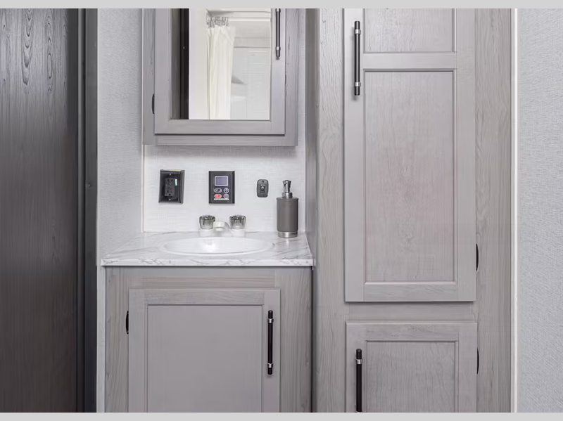 Sleeps 5 Slides 2 Length 32 ft 5 in Ext Height 11 ft 3 in Interior Color Pewter Hitch Weight 775 lbs Dry Weight 7099 lbs Cargo Capacity 2476 lbs Fresh Water Capacity 46 gals Grey Water Capacity 78 gals Black Water Capacity 30 gals Tire Size ST225/75R15D Furnace BTU 30000 btu Available Beds Queen Refrigerator Size 10 cu ft Cooktop Burners 3 Number of Awnings 1 LP Tank Capacity 20 lbs Water Heater Type Girard On Demand Tankless AC BTU 15000 btu Awning Info 12' Power Axle Count 2 Number of LP Tanks 2 Shower Type Standard Similar Floorplans