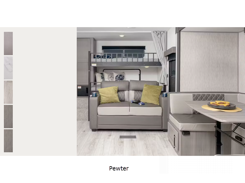 Sleeps 9 Slides 1 Length 29 ft 11 in Ext Height 11 ft 1 in Interior Color Pewter Hitch Weight 675 lbs Dry Weight 6342 lbs Cargo Capacity 1333 lbs Fresh Water Capacity 46 gals Grey Water Capacity 69 gals Black Water Capacity 30 gals Tire Size ST205/75R14D Furnace BTU 30000 btu Number Of Bunks 2 Available Beds Queen Refrigerator Size 10 cu ft Cooktop Burners 3 Number of Awnings 1 LP Tank Capacity 20 lbs Water Heater Type Girard On Demand Tankless AC BTU 15000 btu Awning Info 14' Power Axle Count 2 Number of LP Tanks 2 Shower Type Standard Similar Floorplans