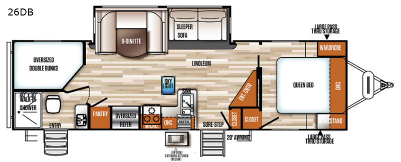 You will find so many features to love about this trailer each time you take it out of storage. From the bunk beds to the optional outside kitchen if you added that feature, you can take the whole family and feed them all from cooking outdoors or inside will full amenities. And having two exterior entries creates a smooth flow of traffic into the full bathroom or the main living and kitchen area. The skylight and windows offer natural lighting and great views on those inside days, and the 20' awning gives you protection from the elements when relaxing outside. Don't forget about having your own oasis in the front bedroom with a queen bed and plenty of storage to stay awhile.
